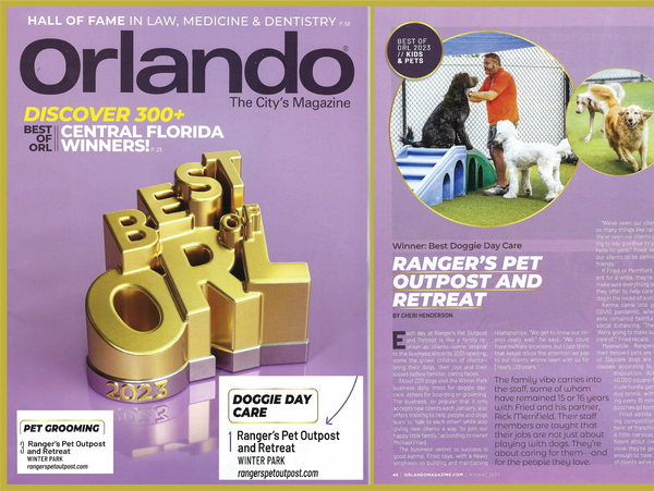 as #1 Best Doggie Daycare and a third place nod for Pet Grooming in Orlando Magazine The City Magazine - 2023 BEST OF ORLANDO..