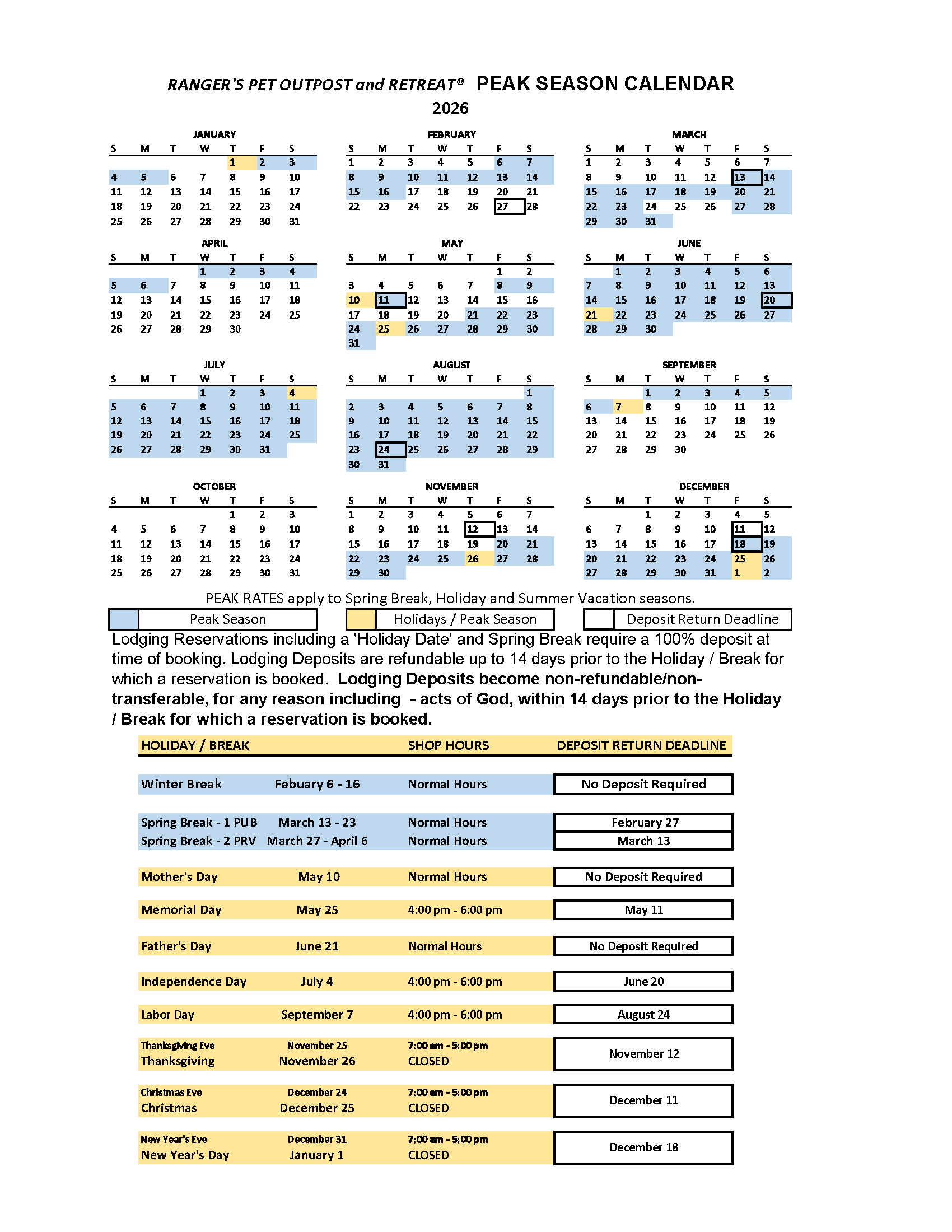 Thank you so much for your interest in Ranger's Pet Outpost and Retreat®. Our New Client Enrollment is now closed for 2025. Of course - we would love to welcome new clients all year long - but - we can only pamper so many pets.